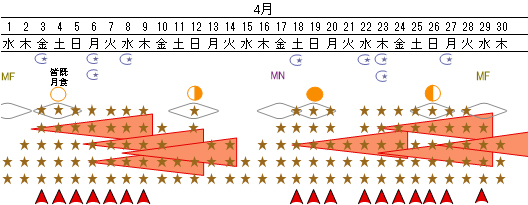 4月に近日点を通過する彗星は9個で、本年最多数の8月10個と近い多さです。月の前半と中頃に4個が集中しており、この付近では太陽の活動が勢いを持ちます。4日の満月は、皆既月食で皆既食の最大は21時頃です。特異日期間は、彗星近日点とその後の2日間が最も注意を要します。